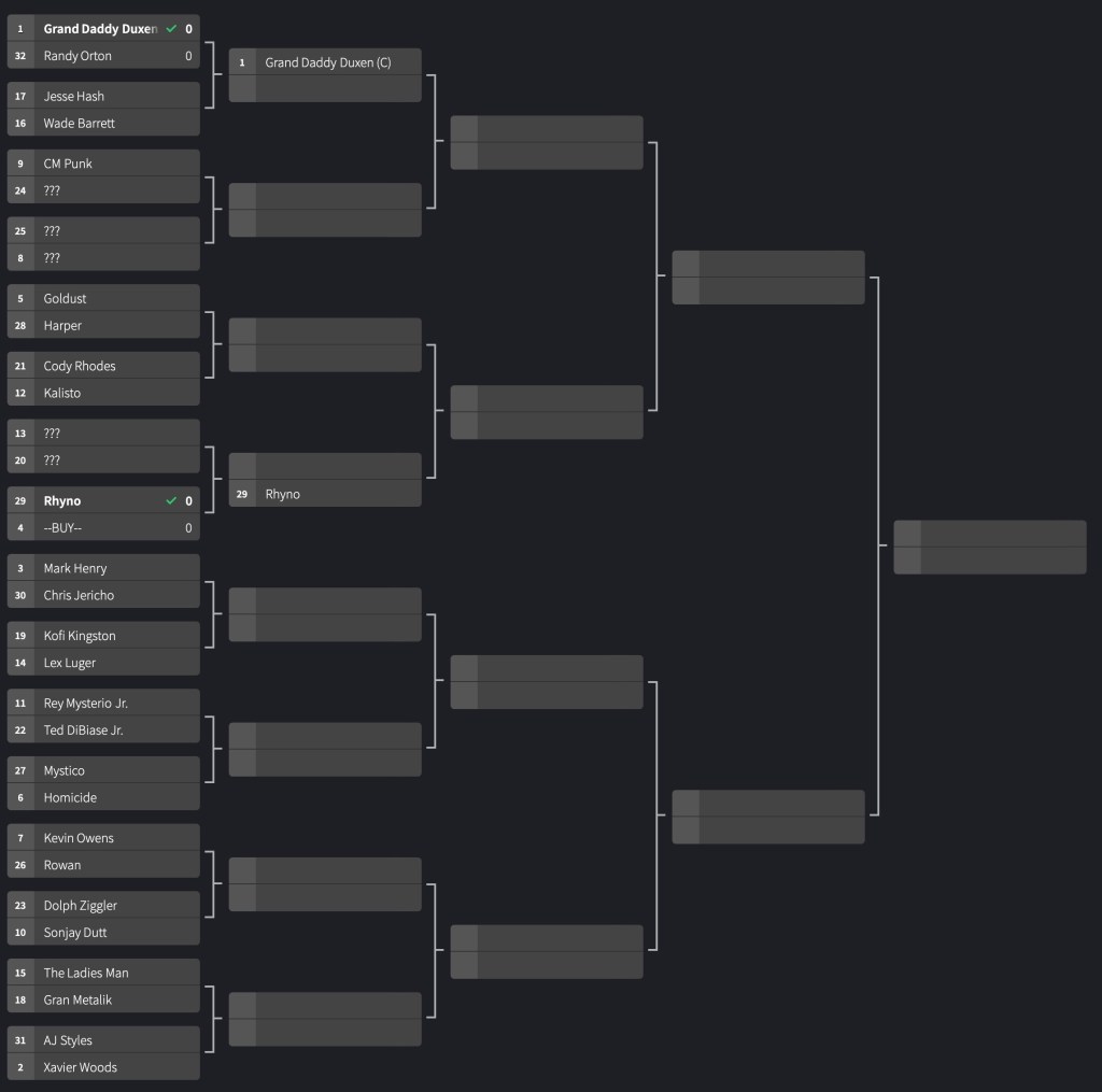 This bracket will be updated as the tournament unfolds; Duxen advanced to the second round after defeating Randy Orton at Starrcade, and Rhyno was given a buy following his confrontation with Megan Mouse.